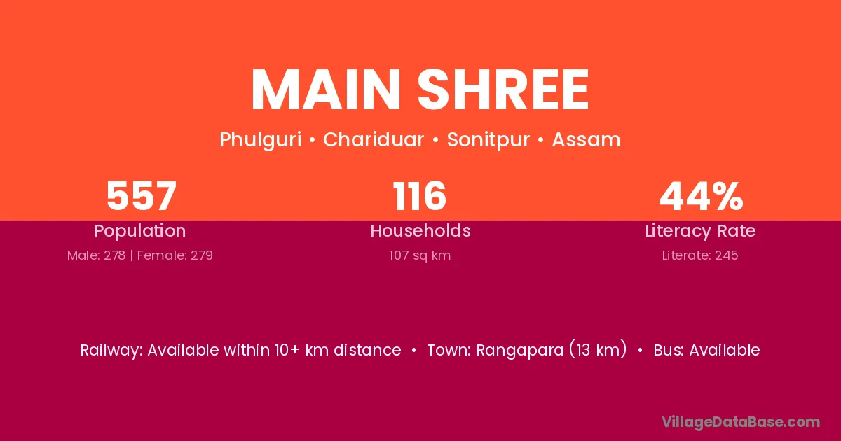 Rangapara (13 km) is the nearest town to Main Shree village for major economic activities and is located approximately 13 km away.