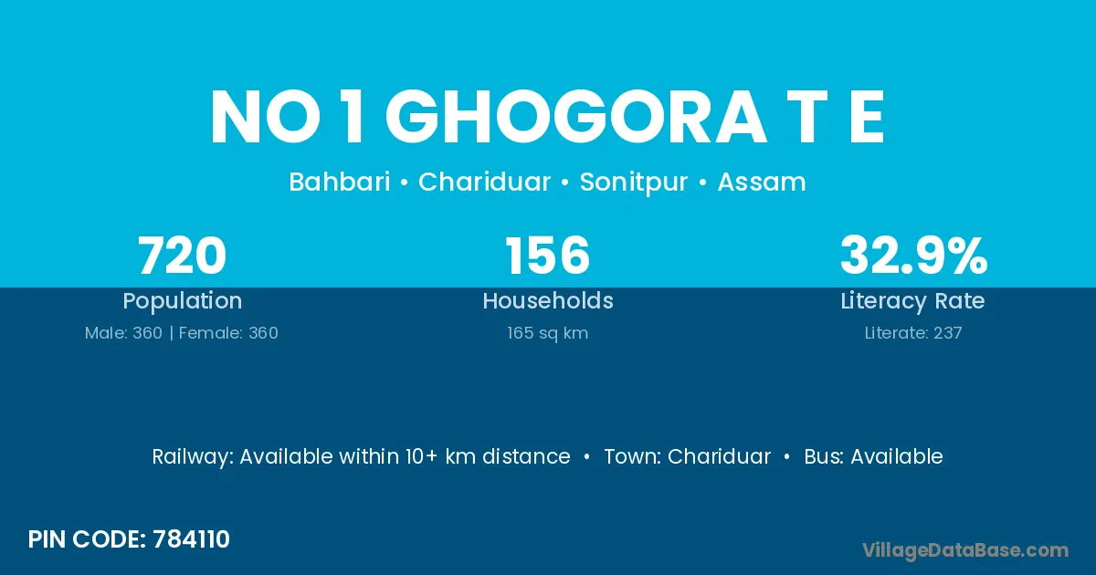 No 1 Ghogora T E village has a total population of 720 people, of which 360 are males and 360 are females.