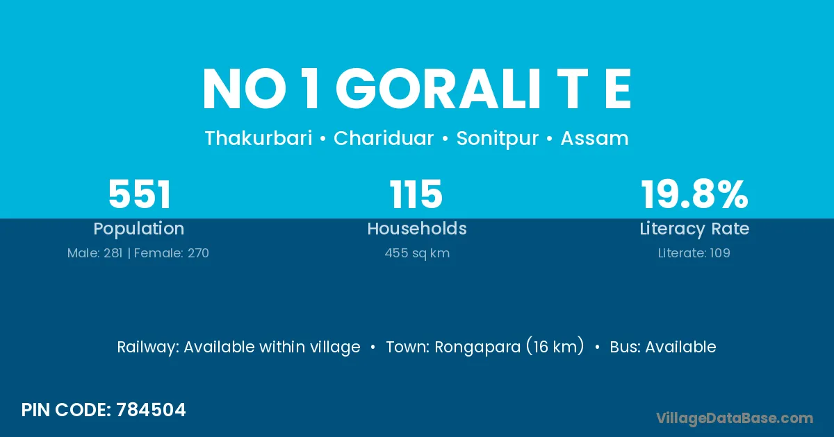 No 1 Gorali T E village has a total population of 551 people, of which 281 are males and 270 are females.