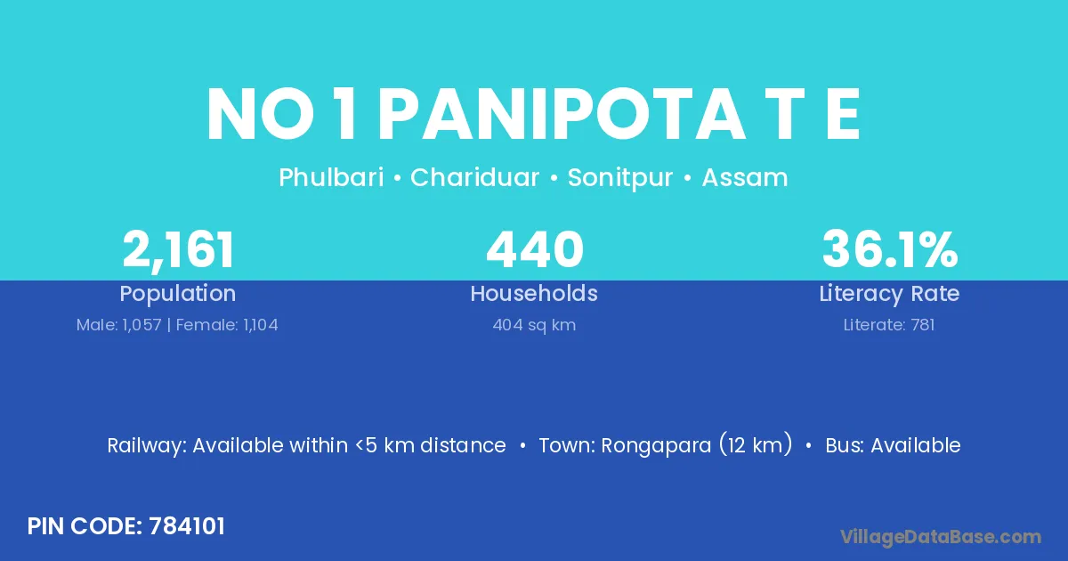Rongapara (12 km) is the nearest town to No 1 Panipota T E village for major economic activities and is located approximately 12 km away.