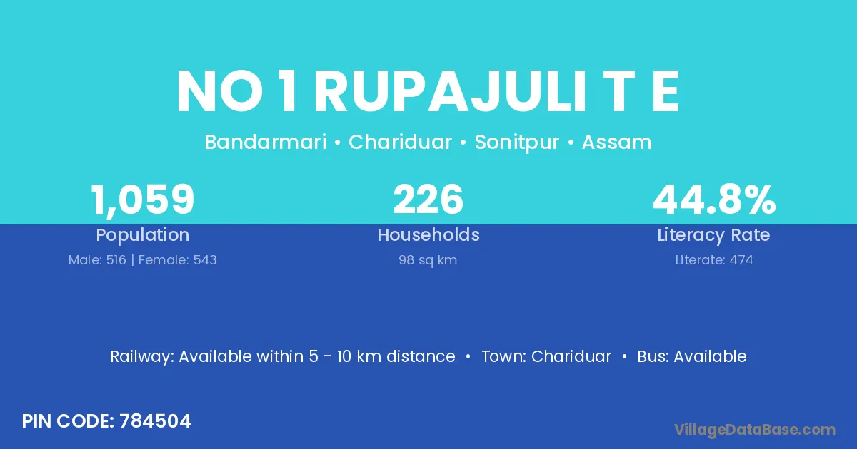 No 1 Rupajuli T E village has a total population of 1,059 people, of which 516 are males and 543 are females.