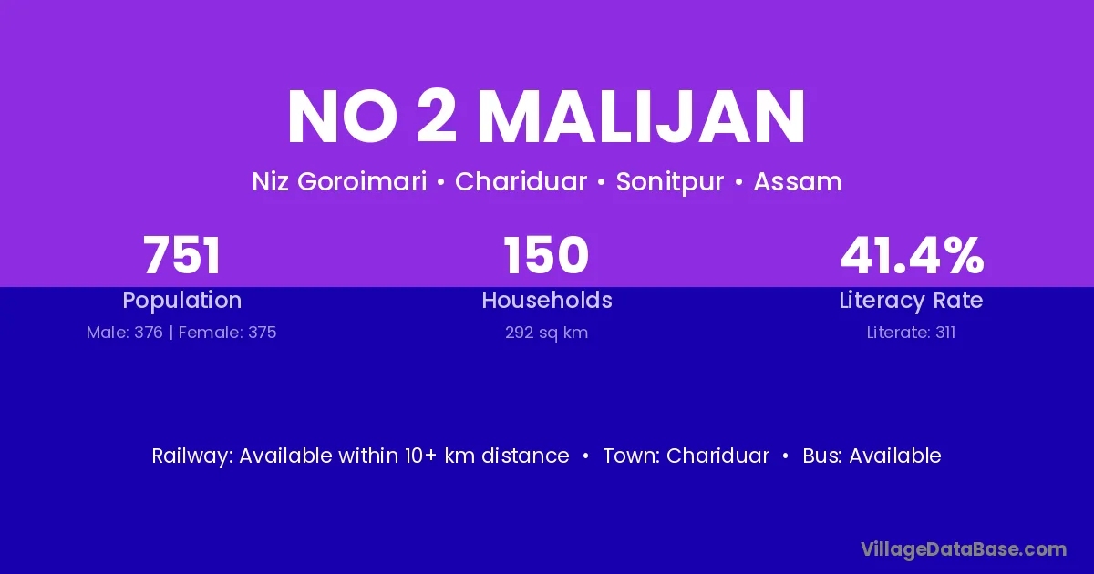 No 2 Malijan village has a total population of 751 people, of which 376 are males and 375 are females.