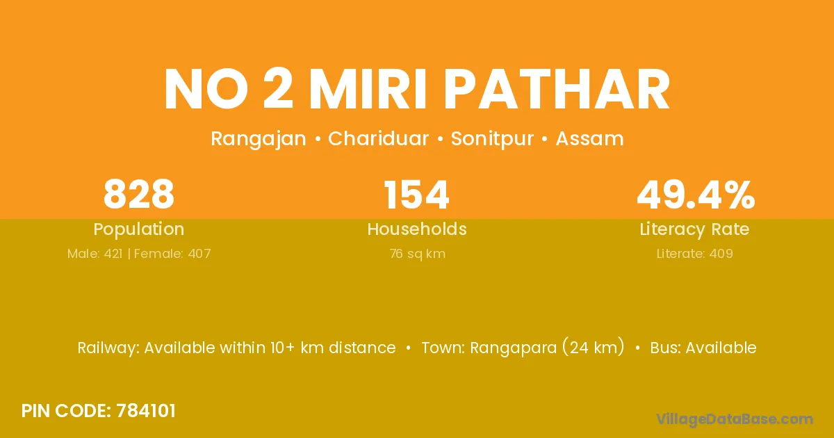 Rangapara (24 km) is the nearest town to No 2 Miri Pathar village for major economic activities and is located approximately 24 km away.