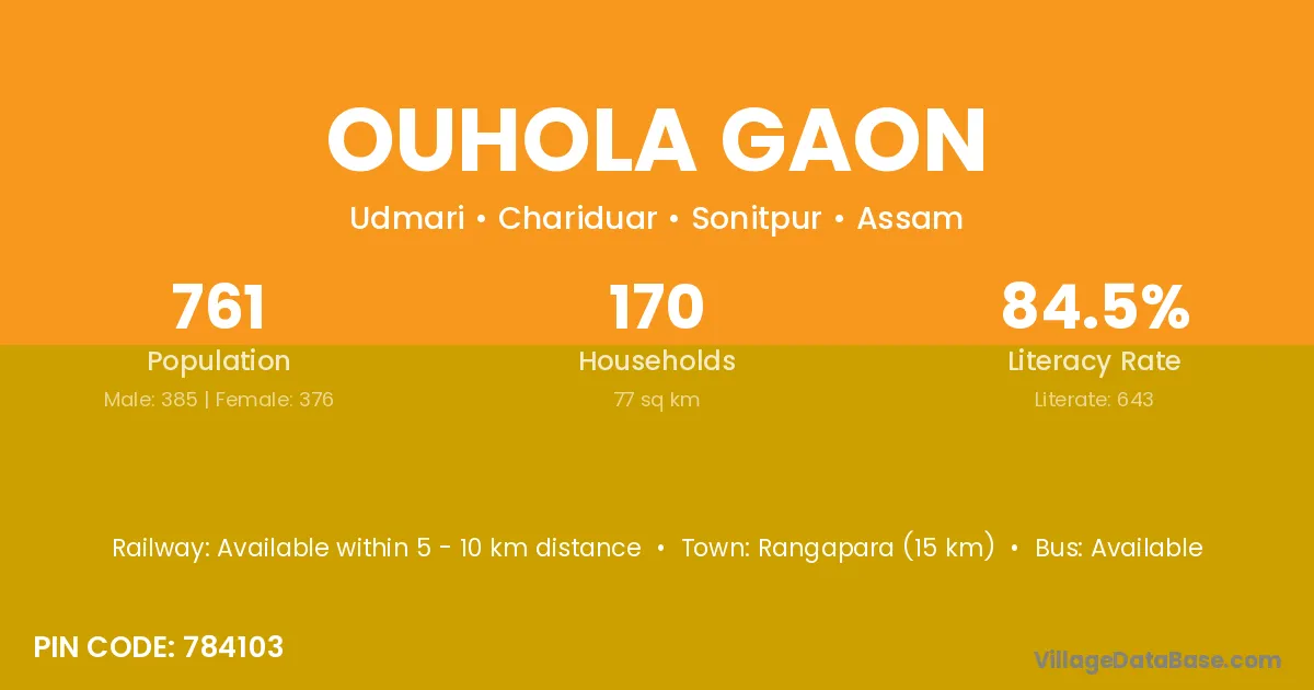 Rangapara (15 km) is the nearest town to Ouhola Gaon village for major economic activities and is located approximately 15 km away.