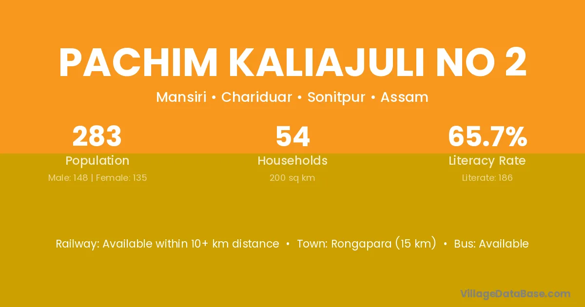 Pachim Kaliajuli No 2 village has a total population of 283 people, of which 148 are males and 135 are females.