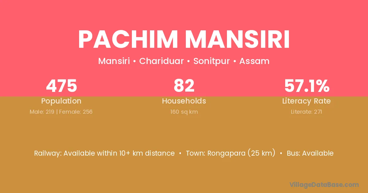 Rongapara (25 km) is the nearest town to Pachim Mansiri village for major economic activities and is located approximately 25 km away.