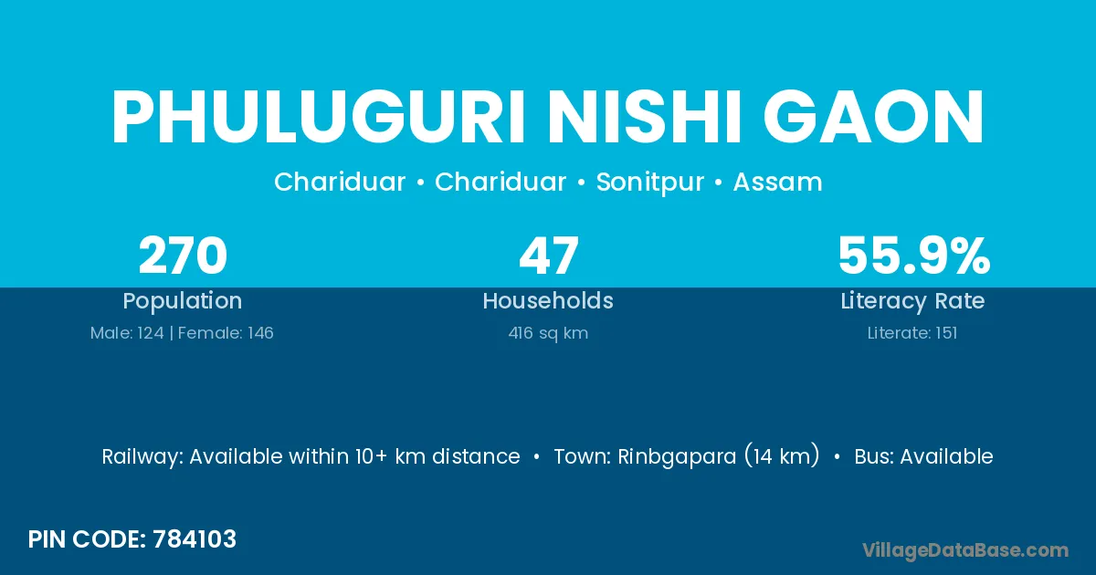 Phuluguri Nishi Gaon village has a total population of 270 people, of which 124 are males and 146 are females.