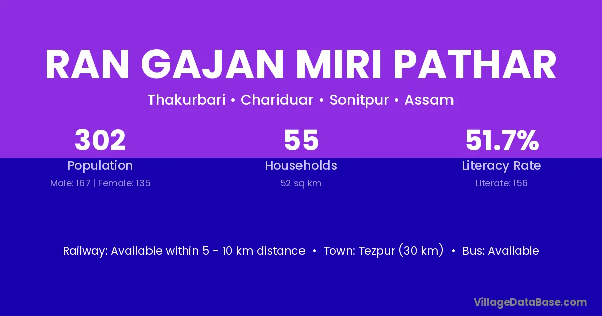 Tezpur (30 km) is the nearest town to Ran Gajan Miri Pathar village for major economic activities and is located approximately 30 km away.