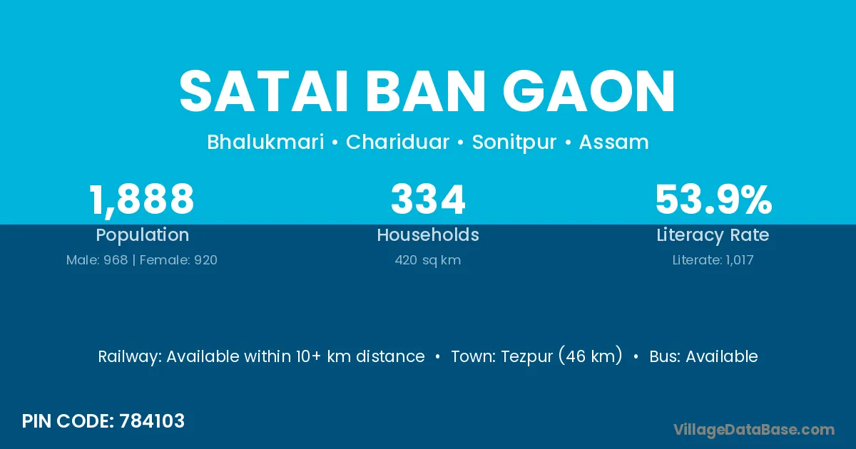 Tezpur (46 km) is the nearest town to Satai Ban Gaon village for major economic activities and is located approximately 46 km away.