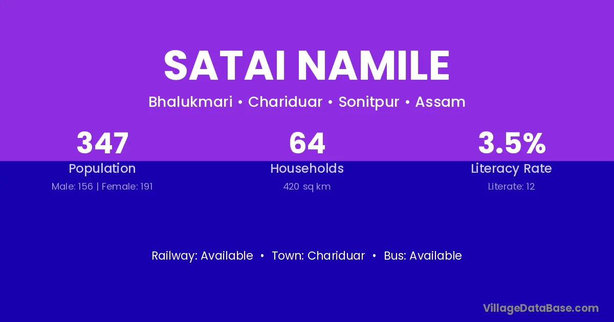 The literacy rate of Satai Namile village is 3.46%. Male literacy stands at 6.41% and female literacy at 1.05%.