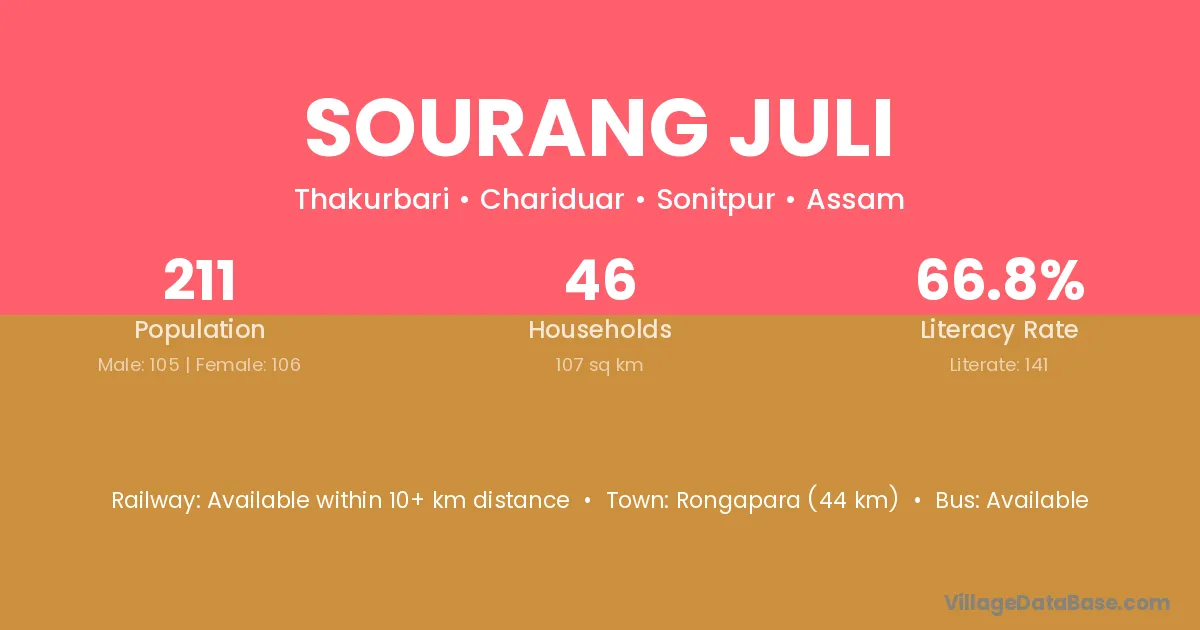 Sourang Juli village has a total population of 211 people, of which 105 are males and 106 are females.