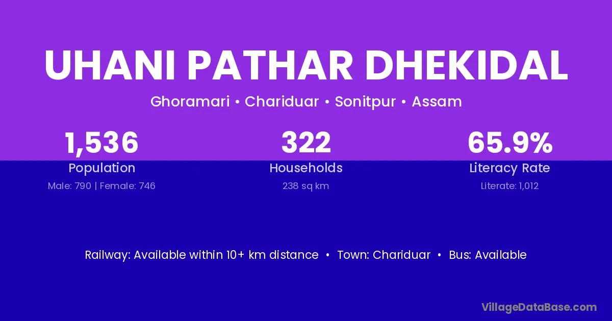 Uhani Pathar Dhekidal village has a total population of 1,536 people, of which 790 are males and 746 are females.