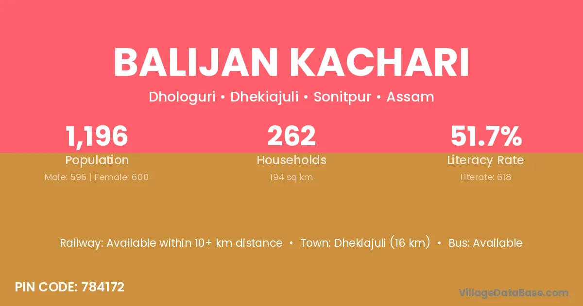 Balijan Kachari village has a total population of 1,196 people, of which 596 are males and 600 are females.