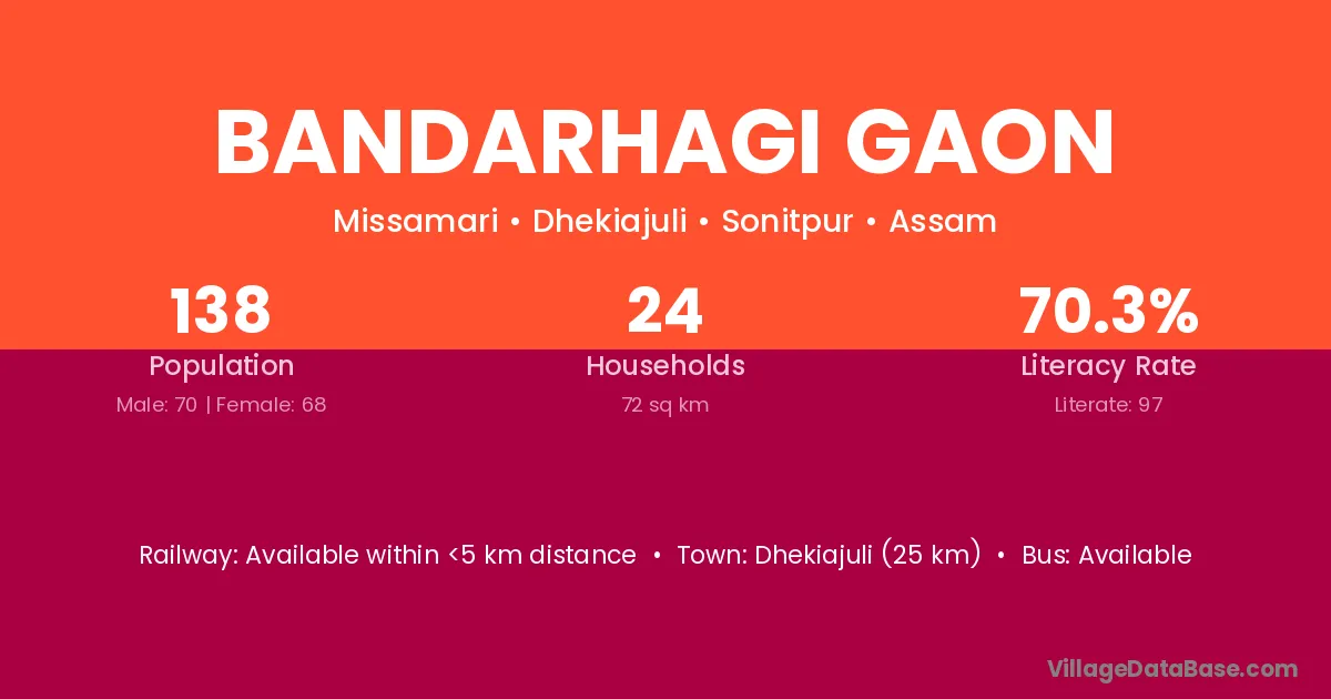 Bandarhagi Gaon village has a total population of 138 people, of which 70 are males and 68 are females.