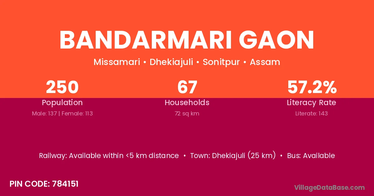Dhekiajuli (25 km) is the nearest town to Bandarmari Gaon village for major economic activities and is located approximately 25 km away.