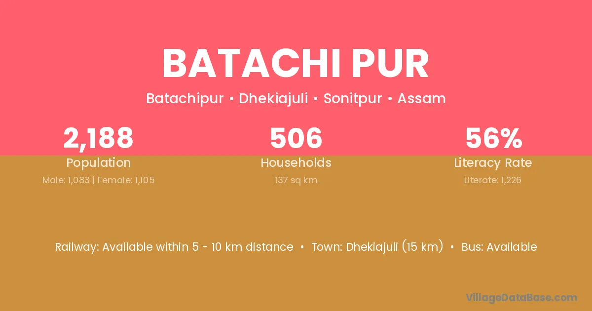 Dhekiajuli (15 km) is the nearest town to Batachi Pur village for major economic activities and is located approximately 15 km away.