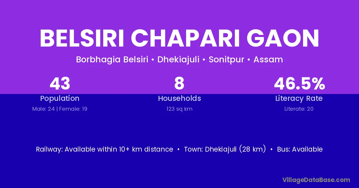 Belsiri Chapari Gaon village has a total population of 43 people, of which 24 are males and 19 are females.