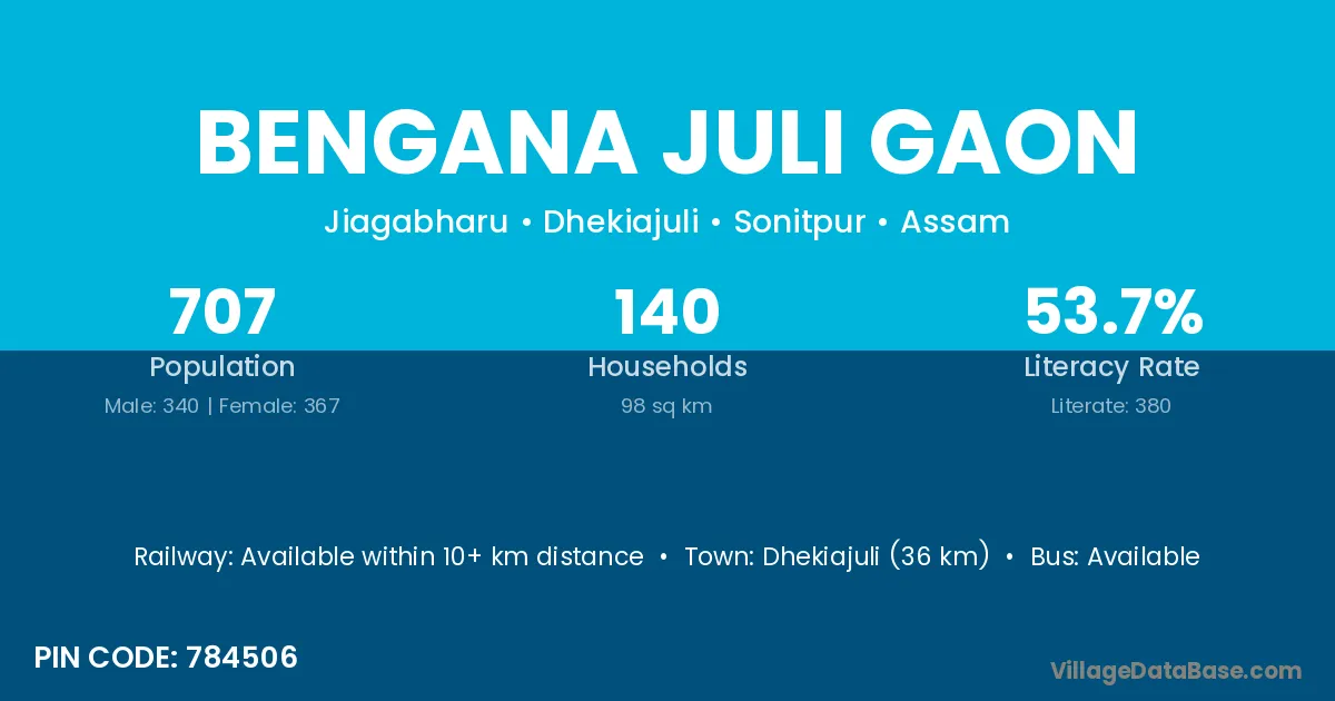 Bengana Juli Gaon village has a total population of 707 people, of which 340 are males and 367 are females.