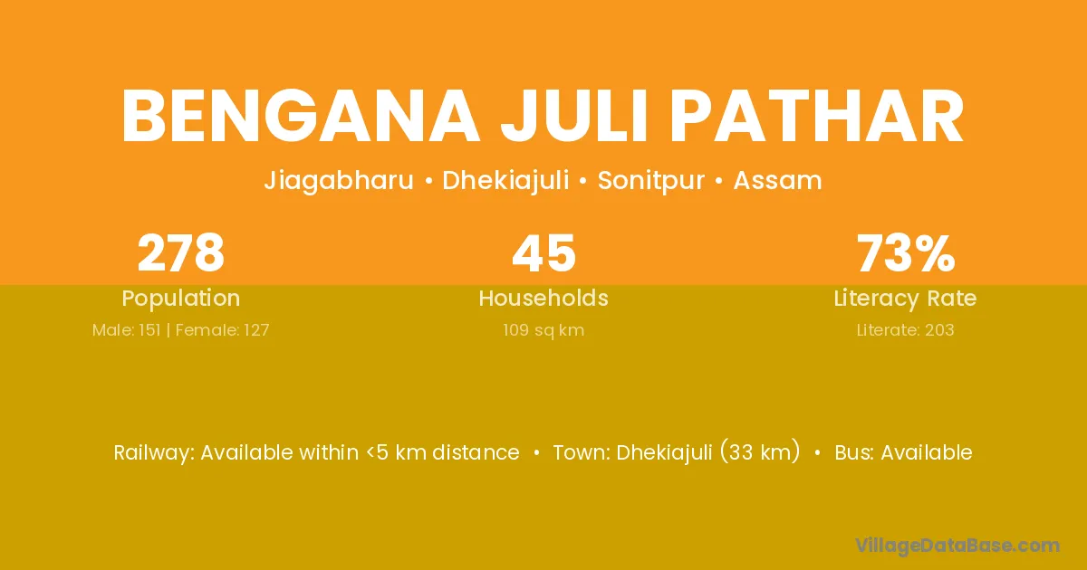 Dhekiajuli (33 km) is the nearest town to Bengana Juli Pathar village for major economic activities and is located approximately 33 km away.