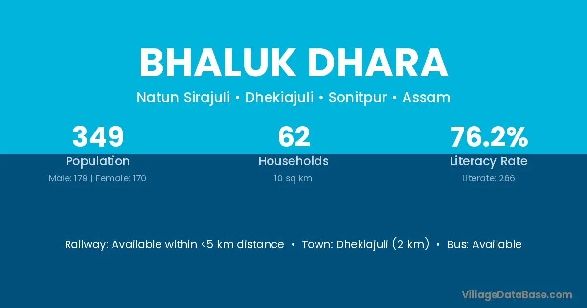 Dhekiajuli (2 km) is the nearest town to Bhaluk Dhara village for major economic activities and is located approximately 2 km away.