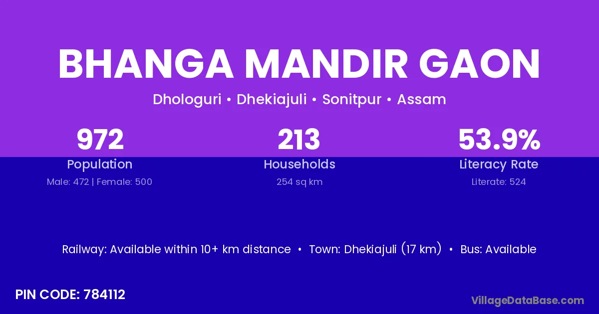 Bhanga Mandir Gaon village has a total population of 972 people, of which 472 are males and 500 are females.