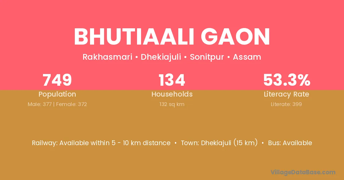 Bhutiaali Gaon village has a total population of 749 people, of which 377 are males and 372 are females.