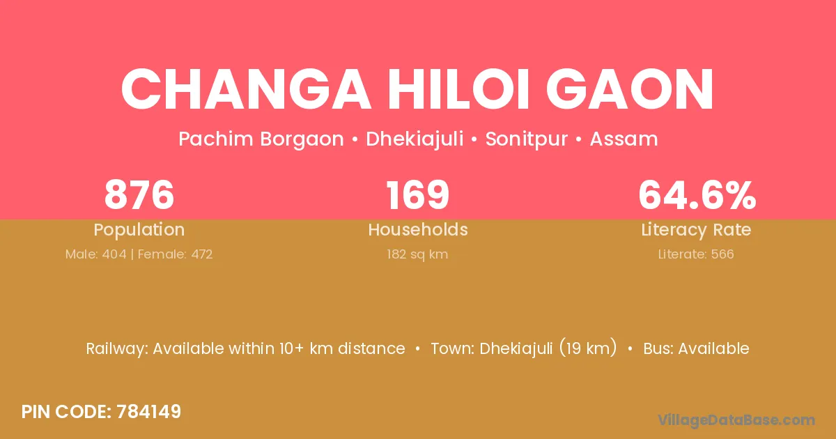 Dhekiajuli (19 km) is the nearest town to Changa Hiloi Gaon village for major economic activities and is located approximately 19 km away.