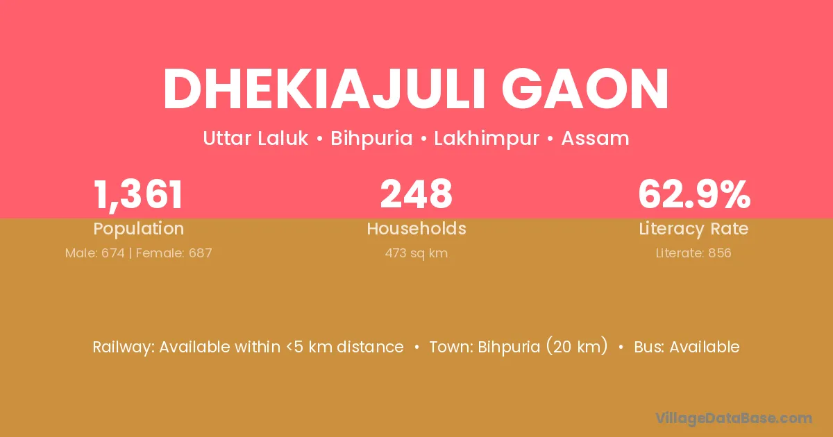 Dhekiajuli (1 km) is the nearest town to Dhekiajuli Gaon village for major economic activities and is located approximately 1 km away.