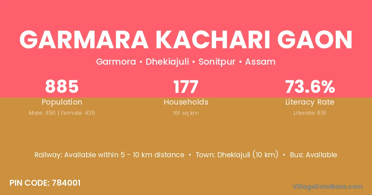 Garmara Kachari Gaon village has a total population of 885 people, of which 450 are males and 435 are females.