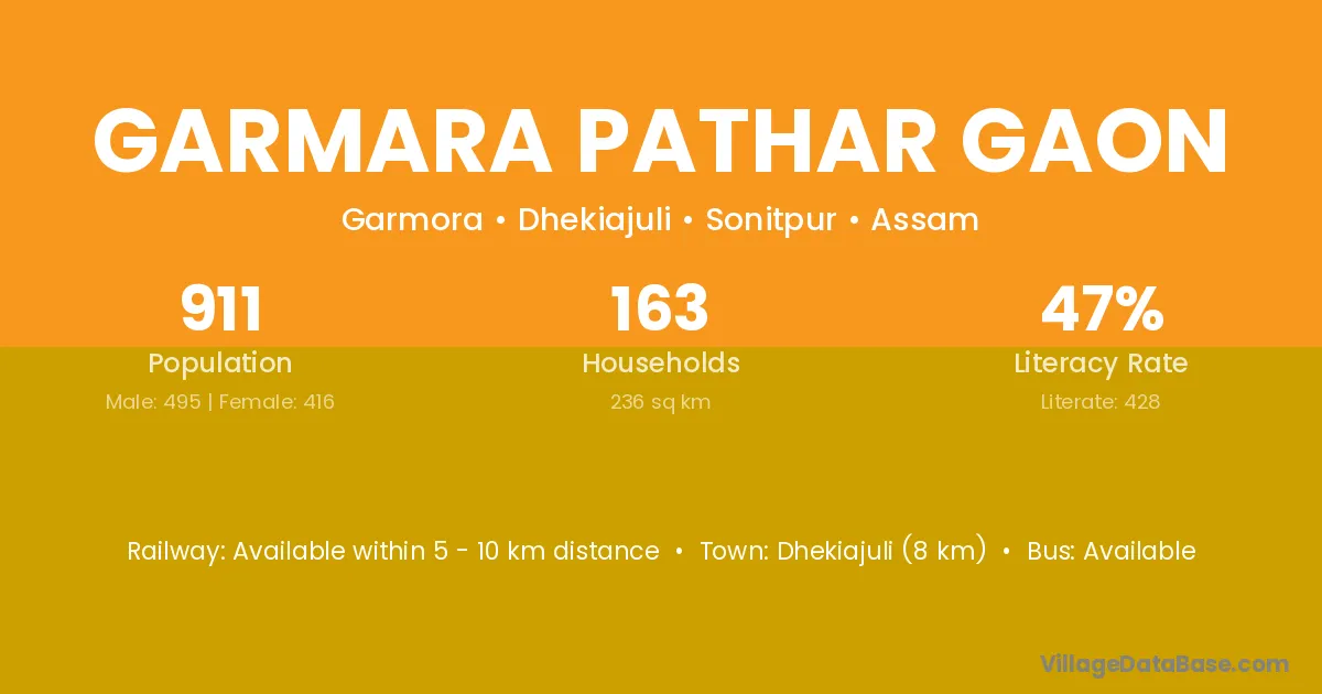 Dhekiajuli (8 km) is the nearest town to Garmara Pathar Gaon village for major economic activities and is located approximately 8 km away.