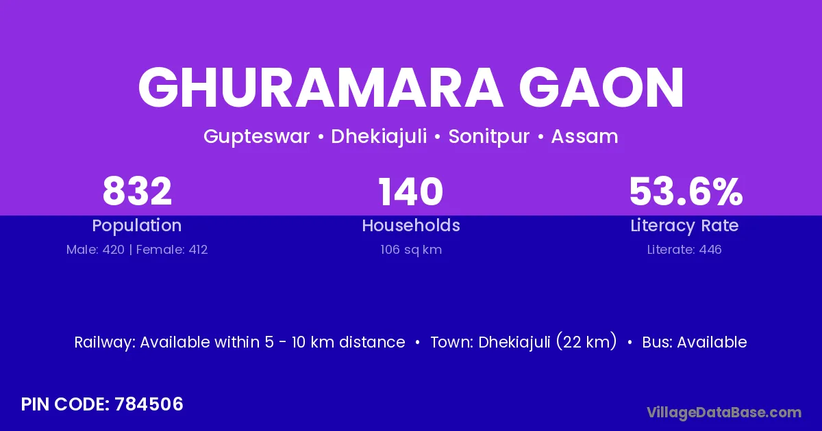 Dhekiajuli (22 km) is the nearest town to Ghuramara Gaon village for major economic activities and is located approximately 22 km away.