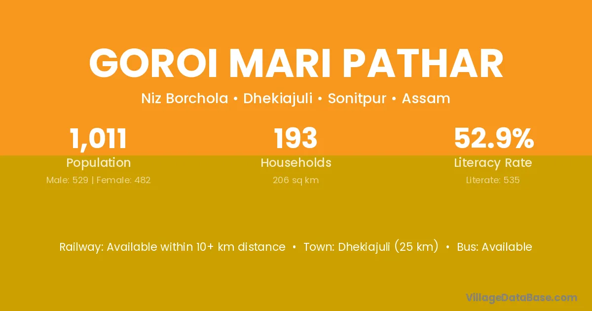 Dhekiajuli (25 km) is the nearest town to Goroi Mari Pathar village for major economic activities and is located approximately 25 km away.