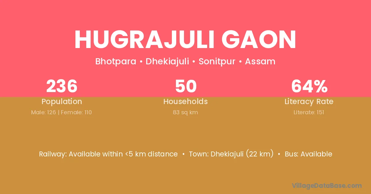 Dhekiajuli (22 km) is the nearest town to Hugrajuli Gaon village for major economic activities and is located approximately 22 km away.