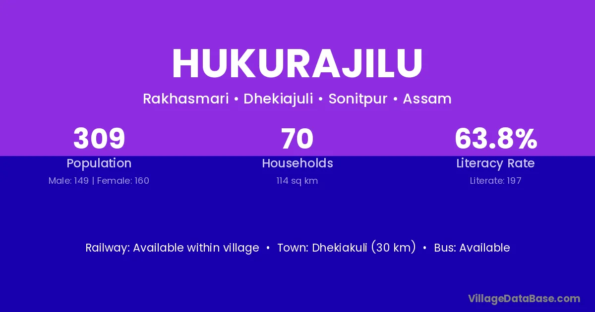 Dhekiakuli (30 km) is the nearest town to Hukurajilu village for major economic activities and is located approximately 30 km away.