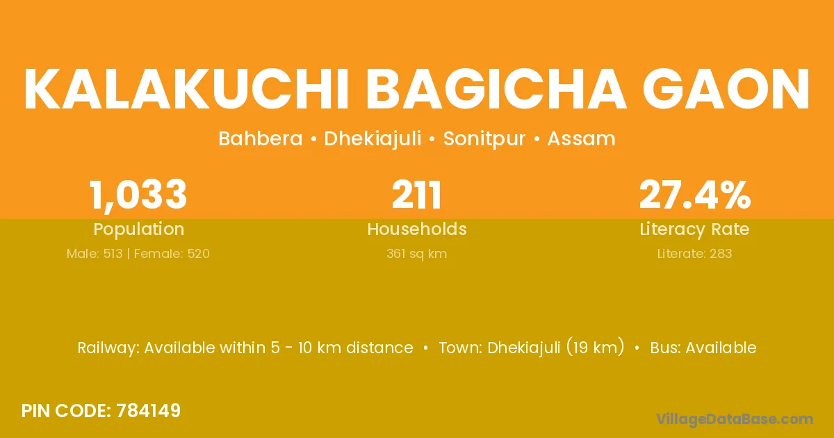 Kalakuchi Bagicha Gaon village has a total population of 1,033 people, of which 513 are males and 520 are females.