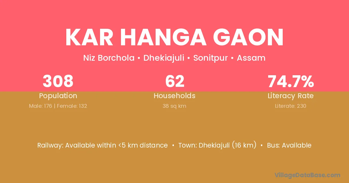 Dhekiajuli (16 km) is the nearest town to Kar Hanga Gaon village for major economic activities and is located approximately 16 km away.