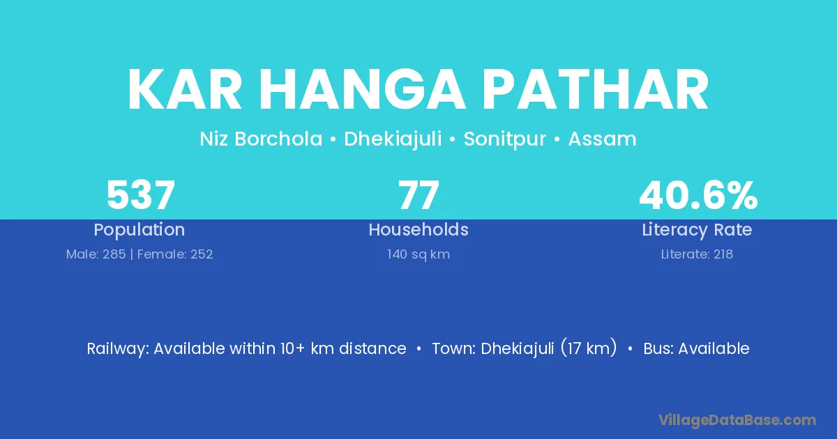 Dhekiajuli (17 km) is the nearest town to Kar Hanga Pathar village for major economic activities and is located approximately 17 km away.