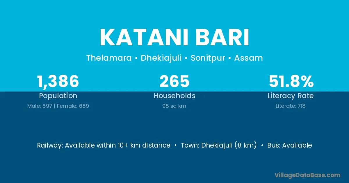 Dhekiajuli (8 km) is the nearest town to Katani Bari village for major economic activities and is located approximately 8 km away.