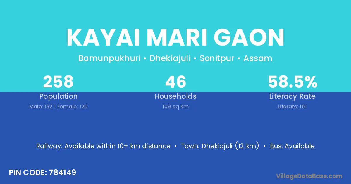 Dhekiajuli (12 km) is the nearest town to Kayai Mari Gaon village for major economic activities and is located approximately 12 km away.