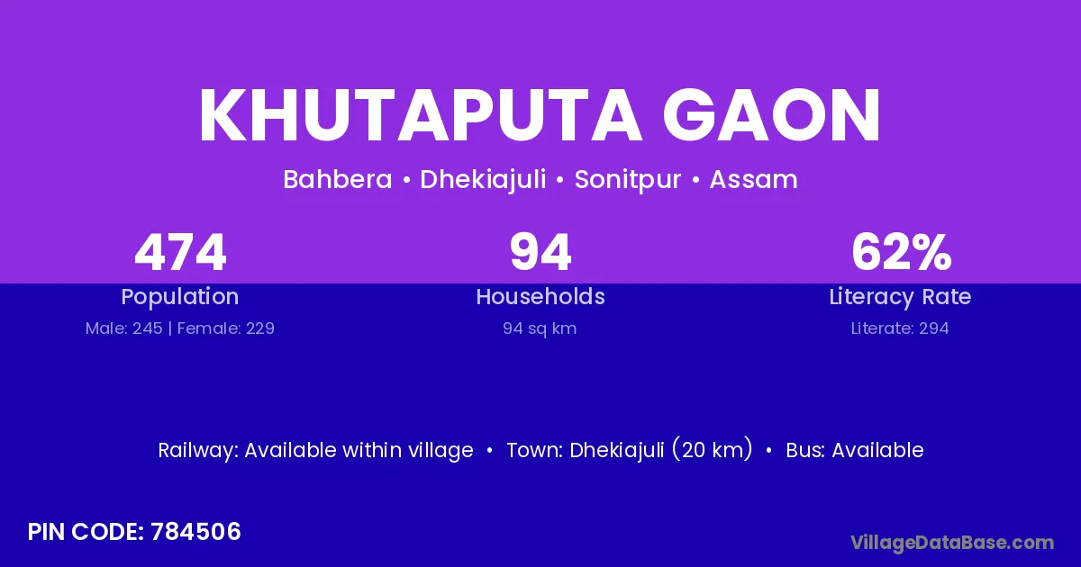 Khutaputa Gaon village has a total population of 474 people, of which 245 are males and 229 are females.