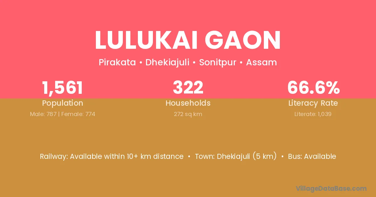 Lulukai Gaon village has a total population of 1,561 people, of which 787 are males and 774 are females.