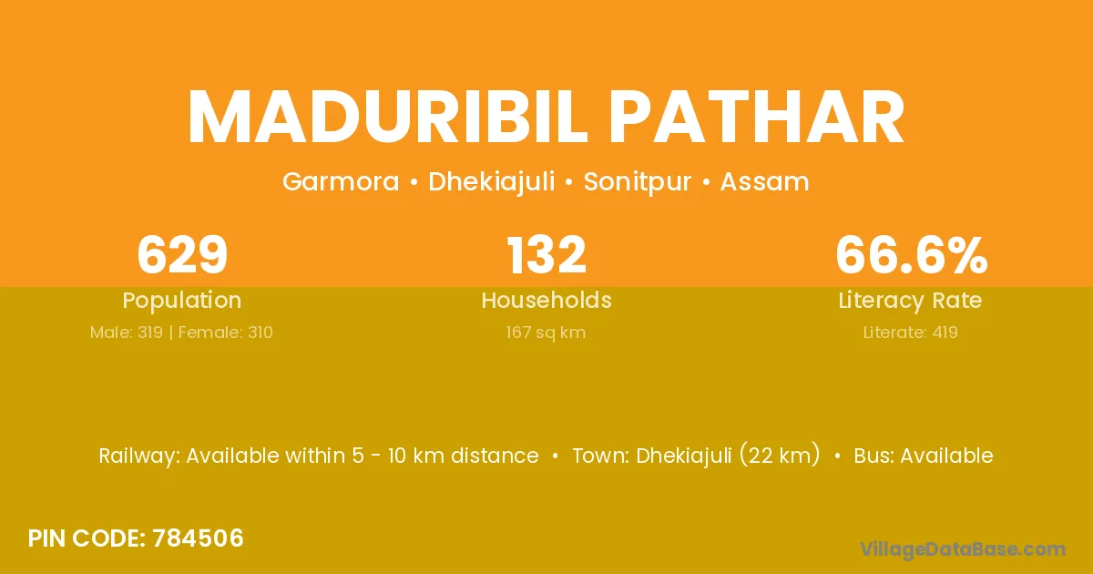 Dhekiajuli (22 km) is the nearest town to Maduribil Pathar village for major economic activities and is located approximately 22 km away.