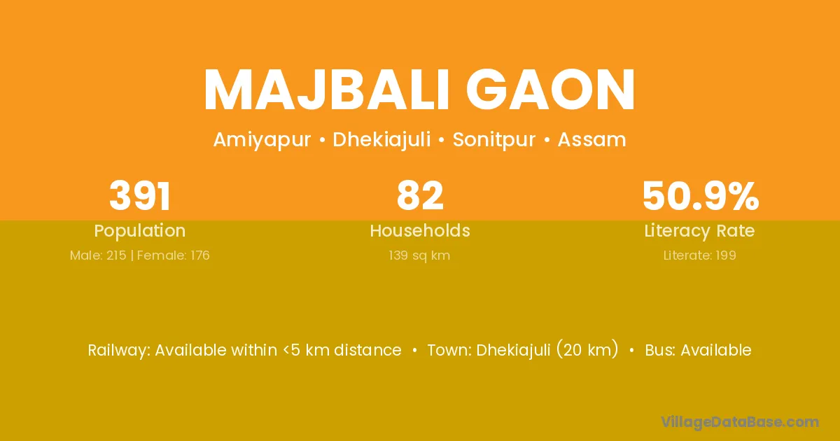 Dhekiajuli (20 km) is the nearest town to Majbali Gaon village for major economic activities and is located approximately 20 km away.