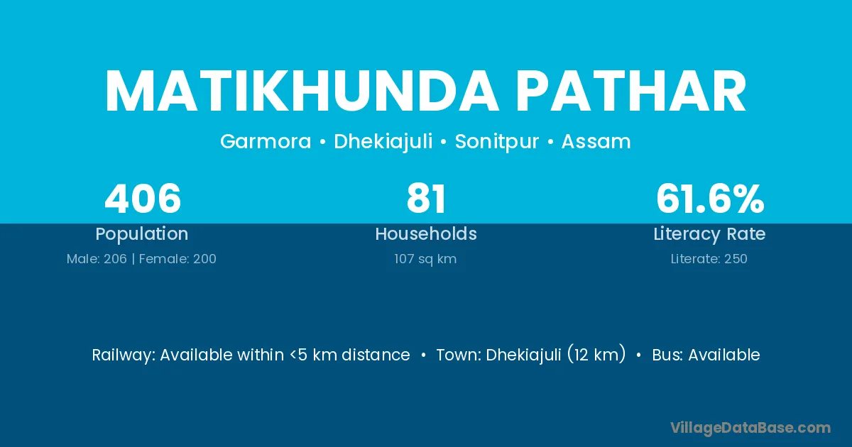Dhekiajuli (12 km) is the nearest town to Matikhunda Pathar village for major economic activities and is located approximately 12 km away.