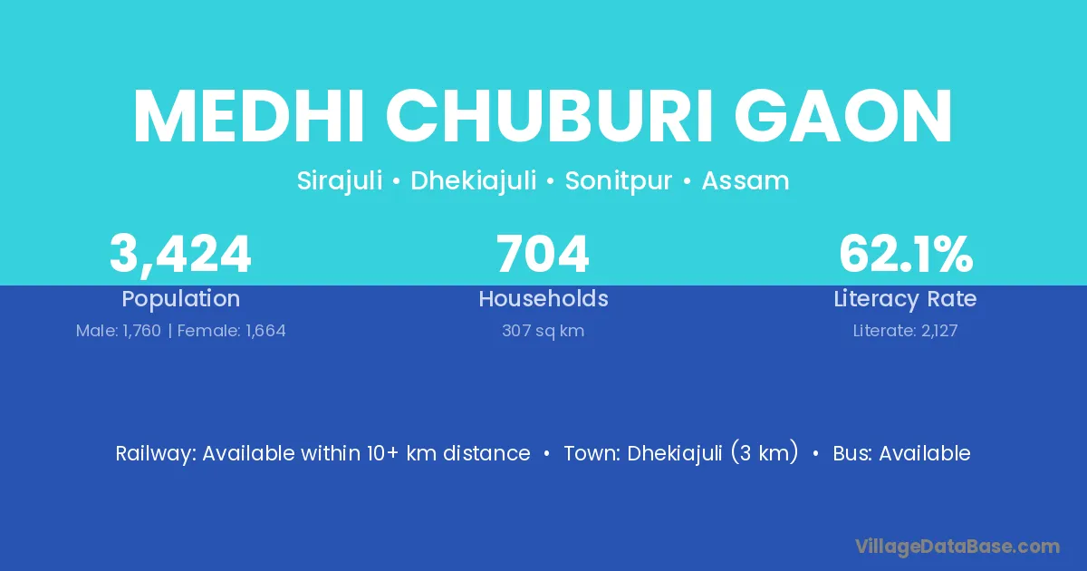 Dhekiajuli (3 km) is the nearest town to Medhi Chuburi Gaon village for major economic activities and is located approximately 3 km away.