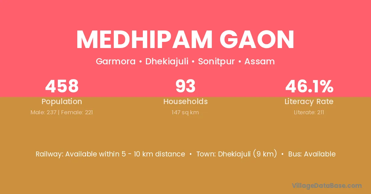 Medhipam Gaon village has a total population of 458 people, of which 237 are males and 221 are females.