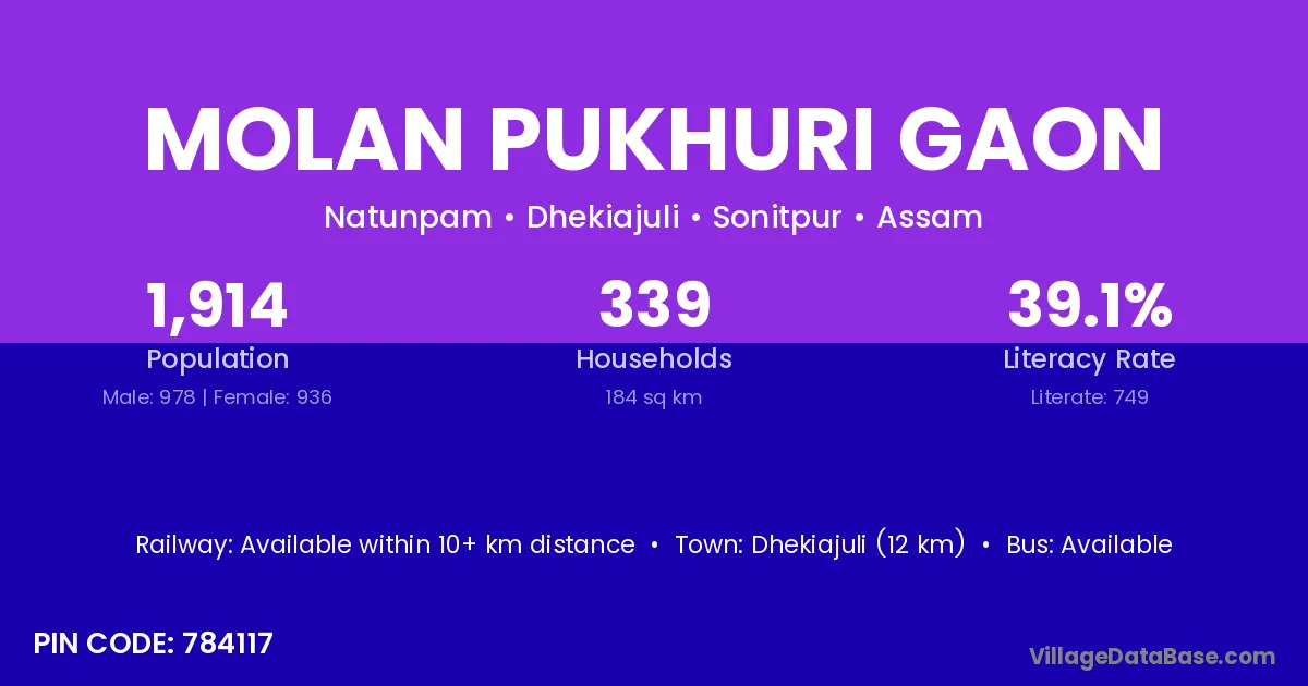 Molan Pukhuri Gaon village has a total population of 1,914 people, of which 978 are males and 936 are females.