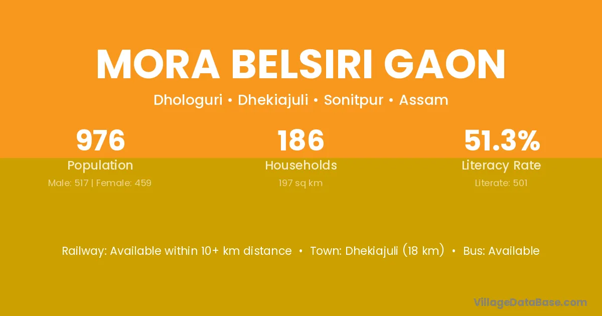 Mora Belsiri Gaon village has a total population of 976 people, of which 517 are males and 459 are females.