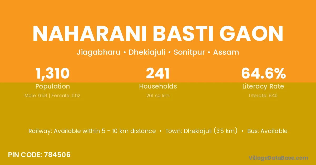 Dhekiajuli (35 km) is the nearest town to Naharani Basti Gaon village for major economic activities and is located approximately 35 km away.