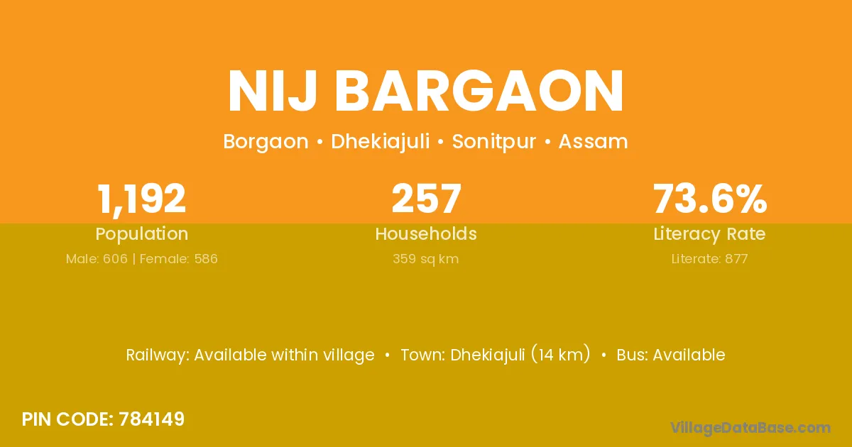 Dhekiajuli (14 km) is the nearest town to Nij Bargaon village for major economic activities and is located approximately 14 km away.